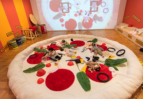 토핑으로 준비된 재료들을 탐색하면서 커다란 도우위에 자신만의 피자를 디자인하는 작품입니다. 벽면에 자신이 만드는 피자를 한눈에 보면서 주어진 시간동안 피자를 만들고 나면 ‘찰칵’소리와 함께 피자의 이미지가 캡쳐되는데, 그때 자신이 피자 토핑의 하나가 되어 피자로 프린트가 됩니다. 가족, 친구들끼리 재미있게 전시를 감상하시고 추억도 남기시길 바랍니다.